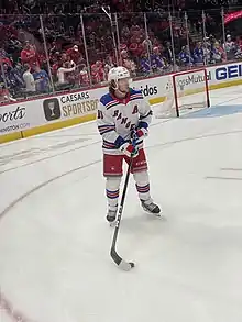 On May 23, David Quinn was hired as the team's new head coach.[67] During the off-season, Hayes, Vesey, Brady Skjei and Spooner all filed for salary arbitration and all of them were re-signed.[68] Despite a mediocre 2018–19 season, Gorton and his team remained committed to rebuilding the franchise. 2017 first-round draft pick Filip Chytil made his NHL debut,[69] and early in the season Ryan Spooner was traded to Edmonton for Ryan Strome.[70] With the trade deadline approaching and their playoff chances slim, the Rangers once again traded away veteran players, with fan-favorite Mats Zuccarello being sent to the Dallas Stars in exchange for two draft picks[71] and Kevin Hayes going to Winnipeg in exchange for a first-round pick, a conditional pick, and forward Brendan Lemieux.[72]
