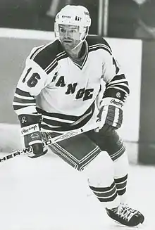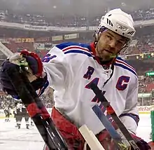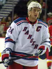 In March 2000, Smith was fired along with head coach John Muckler, and that summer, James Dolan hired Glen Sather to replace him.[25] By the end of the 2000–01 season, the Rangers had landed a significant amount of star power. Messier had returned to New York, Theoren Fleury joined the Rangers after spending most of his career with the Calgary Flames[26] and Eric Lindros was traded to the Rangers by the Flyers.[27] The Rangers also acquired Pavel Bure late in 2001–02 from the Florida Panthers.[28] It was also the rookie season of goalie Dan Blackburn, who made the NHL All-Rookie Team even as the Rangers fell back to last place in the Conference,[29] and finished out of the playoffs. Later years saw other stars such as Alexei Kovalev, Jaromir Jagr, Martin Rucinsky and Bobby Holik added, but in 2002–03 and 2003–04, the team again missed the playoffs. Blackburn started strongly in 2002–03, but burned out after 17 games. He missed 2003–04 due to mononucleosis and a damaged nerve in his left shoulder. Blackburn could not rehabilitate the damaged nerve, and was forced to retire at the age of 22.[30] Towards the end of the 2003–04 season, general manager Glen Sather finally gave in to a rebuilding process by trading away Brian Leetch, Alexei Kovalev, and eight others for numerous prospects and draft picks. With the retirements of Pavel Bure and Mark Messier, as well as Eric Lindros signing with the Toronto Maple Leafs, the post-lockout Rangers, under new head coach Tom Renney, moved away from high-priced veterans towards a group of talented young players, such as Petr Prucha, Dominic Moore and Blair Betts.