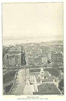 The New York World Building was at 53–63 Park Row, at the northeast corner with Frankfort Street, in the Civic Center of Manhattan, across from New York City Hall. The building initially occupied a roughly parallelogram-shaped land lot with frontage of 115 feet (35 m) on Park Row to the northwest and 136 feet (41 m) on Frankfort Street to the south. It abutted the Brooklyn Bridge to the north and other buildings to the east; the lot originally had a cut-out on the northeastern corner so that the Brooklyn Bridge side was shorter than the Frankfort Street side. Immediately to the south of the site was the New York Tribune Building.[1][2][3] Frankfort Street sloped downward away from Park Row so that while the basement was one level below Park Row, it was only a few steps below grade at the eastern end of the Frankfort Street frontage.[1][3]