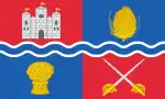 | Blazon | Gules on a Fesse Argent between in chief a Teazle Flower between two Garbs and in base as many Swords in saltire points upwards Or a Bar wavy Azure. |