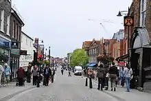 In 1723, the Kennet Navigation made the River Kennet navigable downstream from Newbury to the River Thames in Reading. Some 70 years later, in 1794, work started on the centre section of the Kennet and Avon Canal, which would extend the Kennet Navigation to Bath, thus providing a through water route between London and Bristol via Newbury. This route was finally completed in 1810.[9][15] The opening of the Great Western Railway from London to Bath in 1841 effectively killed the canal and coaching trades, and as the line passed some 25 kilometres (15+1⁄2 mi) to the north it brought no advantage to the town. Newbury had to wait until 1847 to join the railway network, with the opening of the Berks and Hants Railway branch line from Reading to Hungerford via Newbury, and until 1906 to be on a main line, with the opening of the Reading-Taunton line. As a result, Newbury became something of a backwater market town, with an economy based largely on agriculture and horse-racing. The last use of the stocks in Newbury, and probably the UK, was on 11 June 1872 when Mark Tuck was placed in them for 4 hours.[16] In the 1980s, British electronics firm Racal decided to locate their newly formed telecommunications company Racal Vodafone, later Vodafone UK, in the town. In the subsequent decades Newbury became something of a regional centre for the high-tech industries, and the town has since enjoyed a return to general economic prosperity.