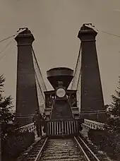 When the American Civil War ended and the United States turned its focus toward rebuilding, Roebling sought state approval to build the Brooklyn Bridge. The government wanted a thorough review of the engineer's credentials; hence, a Bridge Party was organized. Comprising Roebling and his son, as well as their fellow bridge engineers, generals, businessmen, and high society figures, the party toured the country to review four bridges Roebling had built before the civil war.[81] The final item on their itinerary was Roebling's Niagara Suspension Bridge. At the dinner to commemorate the end of the bridge tour, civil war veteran General Henry Warner Slocum gave a toast and called the Suspension Bridge a symbol of inspiration for the United States in its rebuilding efforts. This sentiment was shared by the guests and was expressed at later dinners across the United States.[82] The achievement of building a large suspension bridge over a gorge in the face of overwhelming adversity—constant put-downs by the professional community, American and European—gave the United States a sense of pride. Nationalism rose as the country lauded the bridge. The completion of the bridge that had been deemed impossible by the Western world gave Americans, who had lesser technical accomplishments than Europe at that time, a trophy for their achievements.[83] The Suspension Bridge became the American symbol to brave the toughest of challenges and do the impossible, pushing their drive for industrialization even harder. Charles W. Woodman specifically drew attention to the Suspension Bridge in his 1865 address to the United States Senate for approval to build a rail system to transport a ship out of the water and up around the Niagara Falls.[60]