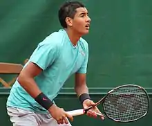 Kyrgios played his first junior match in 2008 at the age of 13 at a grade 4 tournament in Australia. He won his first ITF junior tour title in Fiji in June 2010, aged 15.[26] He started to compete more regularly on the junior tour in 2011, making his junior grand slam debut at the 2011 Australian Open. During 2012 he won two junior grand slam doubles titles and rose to junior world number three, though he withdrew from the Australian Open Men's Wildcard Playoff due to injury.[27] Moving into 2013, he gained the number 1 junior ranking by defeating Wayne Montgomery in the Traralgon International final.[28] A week later he entered the Australian Open as the juniors number 3 seed and progressed to the final against fellow Australian Thanasi Kokkinakis. After saving two set points in the first set, Kyrgios won his first and only junior grand slam title.[29] He also won Wimbledon junior doubles with Kokkinakis.