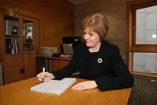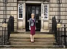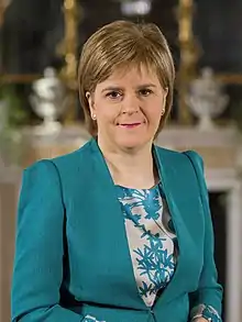Sturgeon was elected unopposed as SNP leader in November 2014 and was subsequently appointed as first minister, becoming the first woman to hold either position.[3][4] She entered office amid a rapid surge in membership of the SNP, which was reflected in the party's performance in the 2015 general election, winning 56 of the 59 Scottish seats and replacing the Liberal Democrats as the third-largest party in the House of Commons. The SNP continued to enjoy electoral successes throughout Sturgeon's nine years in office, but lost 21 seats in the 2017 general election. Despite losing her majority, Sturgeon secured a second term in office in 2016, forming a minority government.