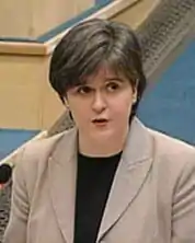 Sturgeon served as Shadow Minister for Health and Community Care from 2000 to 2003, and Shadow Minister for Justice from 2003 to 2004. She also served as a member of the Education, Culture and Sport Committee and the Health and Community Care Committee.[26]