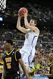 Having made his last 20 consecutive free throws entering the 2013 NCAA Men's Division I Basketball Tournament Sweet Sixteen,[46] Stauskas ended the season with an 85.1% (74–87) free throw shooting percentage,[47] which was better than the Big Ten Conference free throw shooting percentage leader, Adreian Payne (84.8%).[48] In the regional finals on March 31 against Florida, Stauskas made all 6 of his three-point shot attempts, including all 5 in the first half as the team built a 41–17 lead before going into the half up 47–30.[49] This marked the best NCAA Tournament single-game three-point shooting percentage in school history (min 5 attempts) since no other Wolverine has shot 100% with at least 5 attempts.[50] Michigan advanced to the April 8 national championship game where the team lost to Louisville by an 82–76 margin.[51] His 6 three-point shots was a new career best and his 22-point performance tied his career high.[52] All his three-point shots came from the left corner.[53] The 6 three-point shots pushed Stauskas to a Michigan freshman-season record total of 80, surpassing Tim Hardaway Jr.'s two-year-old record of 76.[52][54] Six 3 point shots made without a miss was one shy of a conference record shared by Wolverine Glen Rice and 3 others (including David Lighty's 2011 NCAA Tournament performance).[55] Stauskas joined McGary and Most Outstanding Player Trey Burke on the South All-Regional team.[56] For the season, his .9 fouls per 40 minutes was second in the country.[57]