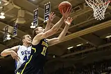 In the offseason, Stauskas added 16 pounds (7.3 kg) to his frame and 6 inches (15.2 cm) to his vertical jump.[58] On November 12, Stauskas posted career highs of 23 points and 5 assists in the second game of the regular season against South Carolina State.[59][60] In the next game, Stauskas contributed a career-high 6 assists as well as 20 points against Iowa State on November 17.[61] Stauskas scored a game-high 24 points on November 21 against Long Beach State in the first round of the Puerto Rico Tip-Off, surpassing his career high[62] set two games before and giving him three consecutive 20-point performances for the first time in his career.[63][64] Stauskas established another career high the next day against Florida State as he scored 26 points including 7 of the team's 13 points in overtime, despite scoring only 3 points in the first half. In the game, he set a career high with 9 made free throws and logged his fourth consecutive 20 point game. Following a Michigan timeout with 11 seconds in regulation, Stauskas made a layup to force overtime.[65][66][67] In the championship game against Charlotte, Stauskas tallied 20 points and a career-high 3 steals.[68] Although Michigan lost in the championship game, Stauskas earned tournament MVP honors.[69] In the second half Stauskas twisted his ankle, but continued to play the final 9½ minutes.[70] Stauskas sat out the November 29 game against Coppin State to rest his ankle.[71][72]