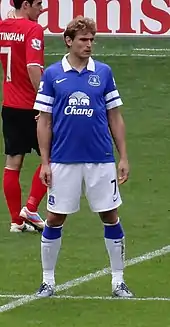 On 31 January 2012, Jelavić signed a four-and-a-half-year contract with Everton for a fee of £5 million.[24][25] He made his debut a few days later, as a second-half substitute for Denis Stracqualursi, in a 1–1 draw against Wigan Athletic at the DW Stadium.[26] On 10 March 2012, Jelavić scored his first goal for Everton in his first start for the club, scoring the only goal of the game in a 1–0 victory against Tottenham Hotspur at Goodison Park.[27] His first FA Cup goal was the opener in a 2–0 win against Sunderland in a quarter-final replay at the Stadium of Light.[28] Jelavić scored his first brace for Everton, a 2‐2 away draw against Norwich City in the league, and the following week he scored the opening goal in a 2–1 defeat by neighbours Liverpool, in the FA Cup semi-final at Wembley Stadium.