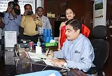 He currently represents the Nagpur constituency in the Lok Sabha, and is a lawyer by occupation. He previously also served as a Minister in various departments which includes Water resources and River development, Shipping, Rural Development and MSME. During the cabinet reshuffle on 7 July 2021 the portfolio for Ministry of MSME which was under him was reassigned to Narayan Rane, another BJP MP from Maharashtra as a part of cabinet expansion. He is often referred to as the "Expressway Man of India" by the media due to his initiation of Mumbai-Pune Expressway and contributions to the development of expressways and other road infrastructure.[6][7] The World Economic Forum has recognized him as the "pioneer of public–private partnership (PPP) in the road sector in India".[8] Under his tenure as Minister of Road and Transport, Indian highway network grew by 59% within 9 years.[9]