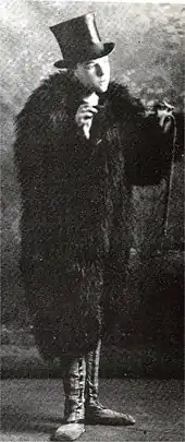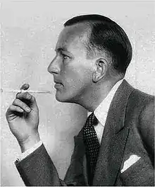 "Why", asked Coward, "am I always expected to wear a dressing-gown, smoke cigarettes in a long holder and say 'Darling, how wonderful'?"[152] The answer lay in Coward's assiduous cultivation of a carefully crafted image. As a suburban boy who had been taken up by the upper classes he rapidly acquired the taste for high life: "I am determined to travel through life first class."[153] He first wore a dressing gown onstage in The Vortex and used the fashion in several of his other famous plays, including Private Lives and Present Laughter.[154][155] George Walden identifies him as a modern dandy.[156] In connection with the National Theatre's 2008 exhibition, The Independent commented, "His famous silk, polka-dot dressing gown and elegant cigarette holder both seem to belong to another era. But 2008 is proving to be the year that Britain falls in love with Noël Coward all over again."[126]