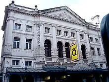 The Noël Coward Theatre in St Martin's Lane, originally opened in 1903 as the New Theatre and later called the Albery, was renamed in his honour after extensive refurbishment, re-opening on 1 June 2006.[122] A statue of Coward by Angela Conner was unveiled by the Queen Mother in the foyer of the Theatre Royal, Drury Lane in 1998.[123] There are also sculptures of Coward displayed in New York and Jamaica,[124] and a bust of him in the library in Teddington, near where he was born.[125] In 2008 an exhibition devoted to Coward was mounted at the National Theatre in London.[126] The exhibition was later hosted by the Museum of Performance & Design in San Francisco and the Academy of Motion Picture Arts and Sciences in Beverly Hills, California.[127] In June 2021 an exhibition celebrating Coward opened at the Guildhall Art Gallery in the City of London.[128]