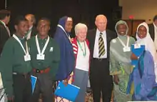 From 1986 to 2009, Borlaug was the President of the SAA. That year, a joint venture between The Carter Center and SAA was launched called Sasakawa-Global 2000 (SG 2000).[48] The program focuses on food, population and agricultural policy.[49] Since then, more than 8 million small-scale farmers in 15 African countries have been trained in SAA farming techniques, which have helped them to double or triple grain production.[50] Those elements that allowed Borlaug's projects to succeed in India and Pakistan, such as well-organized market economies, transportation, and irrigation systems, are severely lacking throughout much of Africa, posing additional obstacles to increasing yields and reducing the ongoing threat of food shortages. Because of these challenges, Borlaug's initial projects were restricted to relatively developed regions of the continent.