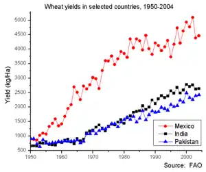 Borlaug received his B.S. in forestry in 1937 and PhD in plant pathology and genetics from the University of Minnesota in 1942. He took up an agricultural research position with CIMMYT in Mexico, where he developed semi-dwarf, high-yield, disease-resistant wheat varieties.[3][1] During the mid-20th century, Borlaug led the introduction of these high-yielding varieties combined with modern agricultural production techniques to Mexico, Pakistan, and India. As a result, Mexico became a net exporter of wheat by 1963. Between 1965 and 1970, wheat yields nearly doubled in Pakistan and India, greatly improving the food security in those nations.[4]