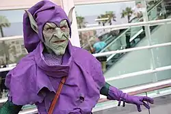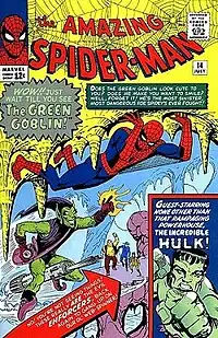 The Green Goblin debuted in The Amazing Spider-Man #14.[4] At this time his identity was unknown, but he proved popular and reappeared in later issues, which made a point of his secret identity. According to both Stan Lee and John Romita, Sr., who replaced Ditko as the title's artist, Lee always wanted the Green Goblin to be someone Peter Parker knew, while Ditko wanted his civilian identity to be someone who had not yet been introduced.[5][6][7] Lee elaborated: "Steve wanted him to turn out to be just some character that we had never seen before. Because, he said, in real life, very often a villain turns out to be somebody that you never knew. And I felt that that would be wrong. I felt, in a sense, it would be like cheating the reader. ... if it's somebody you didn't know and had never seen, then what was the point of following all the clues? I think that frustrates the reader".[7] However, Lee prefaced this statement by admitting that, due to his self-professed poor memory, he may have been confusing the Green Goblin with a different character,[7] and in an earlier essay he had said that he could not remember whether Norman Osborn being the Green Goblin was his idea or Ditko's.[8] Ditko has maintained that it was his idea, even claiming that he had decided on it before the first Green Goblin story was finished. Though Osborn would not be introduced by name until The Amazing Spider-Man #37, Ditko has said that a character he drew in the background of two panels in issue #23 was intended to be Osborn, seeded in advance of the reveal. Lending credence to Ditko's claim, this then-nameless character—a member of a businessmen's club and a friend of J. Jonah Jameson—reappeared in a scene in The Amazing Spider-Man #25, visiting Jameson at his office, then again in the businessman's club in #26 and #27, and when Norman was formally introduced in issue #37, he too was stated to be a member of the club and friend of Jameson's.[3][9]