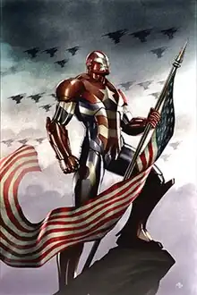 During the "Secret Invasion" by shape-shifting extraterrestrials, the Skrulls, Osborn shoots and kills the Skrull queen Veranke.[77] He leverages this widely publicized success, positioning himself as the new director of the S.H.I.E.L.D.-like paramilitary force H.A.M.M.E.R. to advance his agenda,[77] while using his public image to start his own Dark Avengers, substituting Moonstone for Ms. Marvel, Bullseye for Hawkeye, Gargan for Spider-Man, Daken for Wolverine and Noh-Varr for Captain Marvel, as well as manipulating Ares and the Sentry into helping to further his cause. Osborn himself leads the Dark Avengers as the Iron Patriot, a suit of armor fashioned by himself after Iron Man's armor with Captain America's colors.[78] Osborn simultaneously forms the Cabal alliance with Doctor Doom, Emma Frost, Namor, Loki and the Hood,[79] but this 'alliance' quickly falls apart when Namor and Frost betray the Cabal to aid the X-Men.[80] Norman's attempts to exert his authority are increasingly jeopardized by various superheroes. After the Superhuman Registration Act records are deleted so that Osborn has no access to the information recorded about heroes after it was implemented, Osborn attacked the brain-damaged Tony Stark, thus showing Osborn brutally assaulting a physically and mentally incapable individual that was not even attempting to strike back.[81] After the New Avengers are forced to allow Osborn to capture Cage when needing medical treatment, the team uses a tracking device Osborn had planted in Luke to trick him into blowing up his own house after rescuing Cage from Osborn's custody.[82]