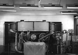 Plans for the delivery of the weapons in combat were assigned to the Weapons Committee, which was chaired by Ramsey, and answerable to Captain William S. Parsons.[18] Ramsey drew up tables of organization and equipment for the Project Alberta detachment that would accompany the USAAF's 509th Composite Group to Tinian. Ramsey briefed the 509th's commander, Lieutenant Colonel Paul W. Tibbets, on the nature of the mission when the latter assumed command of the 509th.[19] Ramsey went to Tinian with the Project Alberta detachment as Parsons's scientific and technical deputy. He was involved in the assembly of the Fat Man bomb, and relayed Parsons's message indicating the success of the bombing of Hiroshima to Groves in Washington, D.C.[20]