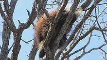 Natural predators of this species include fishers (a cat-sized mustelid),[20] wolverines,[21] coyotes, wolves,[22] American black bears,[23] and cougars,[24] as well as humans. The only known avian predators of this species are golden eagles and great horned owls.[25][26][27] In many cases, injury or even death may occur in the predator from embedded porcupine quills even if they are successful in dispatching the porcupine.[28][29]