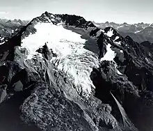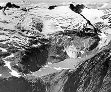 While alpine glaciers are a defining feature of the Cascade Range as a whole, this is especially true of the North Cascades. The stratovolcanoes (Mount Baker and Glacier Peak) are the most obviously glaciated peaks and have the largest glaciers, but many of the smaller, nonvolcanic peaks are glaciated as well. For example, the portion of the Cascades north of Snoqualmie Pass (roughly the North Cascades as defined in this article) These glaciers all retreated from 1900 to 1950. From 1950 to 1975 many but not all North Cascades glaciers advanced. Since 1975 retreat has become more rapid with all 107 glaciers monitored retreating by 1992. 2015 was an especially damaging year for Cascadian Glaciers, an estimated mass loss of five to ten percent, the single greatest loss in over 50 years.[20] There are approximately 700 glaciers in the range, though some have already disappeared.[21] Since a brief advancing period in the 1950s, most of these glaciers have been retreating. This is a serious concern to water managers in the region, as the glaciers (and the winter snowpack) form a large reservoir of water. As snow and ice melts in the summer, the resulting meltwater compensates for the seasonal decrease in precipitation. As glaciers retreat they will provide less summer runoff.