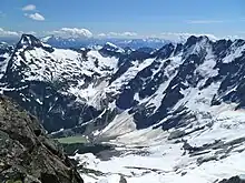 [13] Many tall waterfalls occur where meltwater from mountain glaciers drop down a headwall, which are common occurrences in the North Cascades. Many waterfalls, despite their great height, are non-notable as they are not clearly visible and often have low volume. Seahpo Peak Falls, despite its great height at nearly 2,200 feet (670 m), is an example of one of these waterfalls. A few notable exceptions do occur; Sulphide Creek Falls occurs where meltwaters from two of the largest Mount Shuksan glaciers are forced through a narrow chute over a 2,183-foot (665 m) headwall at the head of Sulphide Valley.
