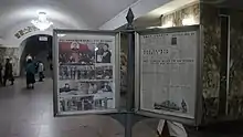 Images of Kim Il Sung and Kim Jong Il are prominent in places associated with public transportation, hanging at every North Korean train station and airport.[54][112] Every North Korean household is required to have a picture of both Kims hanging on a wall. Nothing else may hang on that wall and they are given special cloths to clean the images daily.[113] Party members in neighborhoods are assigned to inspect houses for dusty portraits. If dust is found, a fine has to be paid, its amount depending on the thickness of the layer. The portraits have to be hung high up, so that people in the room may not stand higher than them.[114] Party cadres and military officials must keep three portraits, that of the two deceased leaders and one of Kim Il Sung's wife, Kim Jong-suk.[54] The images are only allowed to be made by government approved artists at specific Mansudae workshops.[54] Images found within newspapers or other publications are to be respected and one must not throw away, deface or otherwise misuse a page that contains an image.[31] They are to be collected and returned. Adult North Koreans are also required to wear a lapel pin that features their image on the left side, above their heart.[113]