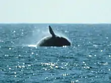 As of 2006, scientists had minimal success satellite tagging North Pacific right whales.[28] Observations total probably less than 50 hours over the last 50 years. What little is known about North Pacific right whale behavior suggests that it is similar to the behavior of right whales in other oceans, except in its choice of wintering grounds. The individual which was observed during a whale-watching tour off the Kii Peninsula, Japan breached six times in a row in 2006.[29] The same whale watching operator had two sightings in 2006 and again had a very close encounter with a right whale in 2011. This animal was very curious and active; it swam around the vessel for more than 2 hours, breaching, spyhopping, tail-slapping, and pec-slapping close to the boat. The ship had to cruise away from the whale because it kept following them. Another curious and playful individual was encountered during a whale-watching trip off Bonin Islands in March 2014.[30]