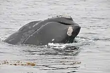 Right whales are also unique in that they all have callosities—roughened patches of epidermis covered with thousands of small light-colored cyamids. The callosities appear in patches on its head immediately behind the blowholes, along the rostrum to the tip, which often has a large callosity, referred to by whalers as the "bonnet".[20] The functional purpose of the callosities has not been determined.