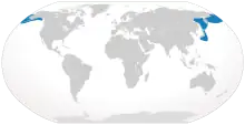 Many of the very near shore sightings of North Pacific right whales have occurred in Russia, Japan, and South Korea.[39] They have been seen to enter into ports,[40] staying just next to piers or wharfs,[41][42] and there have been regular records of whales being entangled in set nets along Japanese and South Korean coasts[39] in recent years.