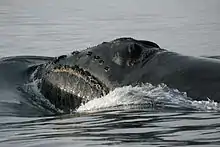 E. japonica is easily distinguished from other North Pacific whale species by several fieldmarks: lack of dorsal fin or bump, very broad, black back, cyamid-covered callosities on the head and lips, a very arched jaw line, a very narrow rostrum, and often a V-shaped spout. North Pacific right whales can reach 15 to 18.3 m (49 to 60 ft) in length as adults, larger than the North Atlantic right whale.[13] Typical body mass is from 50,000–80,000 kg (110,000–180,000 lb),[14] or to 100,000 kg (220,000 lb) which weighs twice as of typical humpback whales.[15] There is one record of a 19.8 m (65 ft) whale captured during illegal Soviet operations,[16] while reliability of larger measurements of 20.7 m (68 ft) with 135,000 kg (298,000 lb)[17] and 2 cases of 21.3 m (70 ft)[18][19] one each from eastern and western pacific sides are uncertain. They are much larger than gray or humpback whales and also being very stout, particularly when compared to the other large baleen whales such as blue and fin whales. For 10 North Pacific right whales taken in the 1960s, their girth in front of the flippers was 0.73 of the total length of the whale.[20] There have been claims that pectoral fins of pacific right whale are larger in portion than the other right whales and more pointed, and there may exist shape differences of tail by individuals or sex.[19] Additionally, differences of coloration and shape (minor) of baleen plates between pacific and Atlantic have been noted.