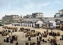 Coastal management today consists of several levels.[67] The dike slope reduces the energy of the incoming sea, so that the dike itself does not receive the full impact.[67] Dikes that lie directly on the sea are especially reinforced.[67] The dikes have, over the years, been repeatedly raised, sometimes up to 9 metres (30 ft) and have been made flatter to better reduce wave erosion.[68] Where the dunes are sufficient to protect the land behind them from the sea, these dunes are planted with beach grass (Ammophila arenaria) to protect them from erosion by wind, water, and foot traffic.[69]