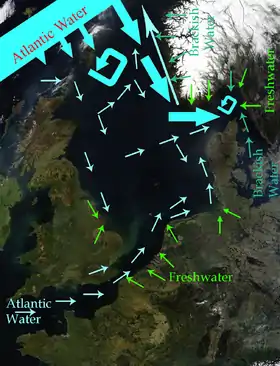 The North Sea is an arm of the Atlantic Ocean receiving the majority of ocean current from the northwest opening, and a lesser portion of warm current from the smaller opening at the English Channel. These tidal currents leave along the Norwegian coast.[20] Surface and deep water currents may move in different directions. Low salinity surface coastal waters move offshore, and deeper, denser high salinity waters move inshore.[21]