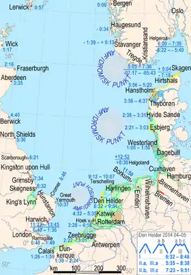 | 0.25–0.60 | 0.65 | Stavanger[59] | North of that amphidromic point, tidal rhythm irregular |