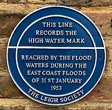 A blue plaque marking the level of the flood water was installed by the Leigh Society on the wall of the Heritage Centre in Leigh-on-Sea to commemorate the flooding there.[36]