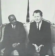 Sallal declared "I warn America that if it does not recognize the Yemen Arab Republic, I shall not recognize it!".[30] US Chargé d'Affaires in Taiz, Robert Stookey, reported that the republican regime was in full control of the country, except in some border areas. However, the British government was insisting on the strength of the Imam's tribal support. A letter written by President Kennedy to Faisal dated October 25, which was kept confidential until January 1963, said: "You may be assured of full US support for the maintenance of Saudi Arabian integrity".[31] American jet aircraft twice staged shows of force in Saudi Arabia. The first involved six F-100 jets staging stunt-flying demonstrations over Riyadh and Jeddah;[32] on the second, two jet bombers and a giant jet transport, while returning to their base near Paris after a visit to Karachi, Pakistan, put on a demonstration over Riyadh.[33]