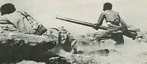 Meanwhile, the Egyptians had planned a coordinated drive from Sadah to the southwest, below the Razih mountains, hoping to link up with the force coming from Haradh. They were counting on a local sheik, whose forces were to supposed to join 250 Egyptian parachutists. The sheik failed to deliver, and the parachutists made their way back to Sadah, suffering losses from snipers on the way. Al-Badr had sent radio messages and summonses by runner in all directions calling for reinforcement. He asked reserve forces training in the Jawf to arrive in trucks mounting 55- and 57-millimeter cannon and 81 millimeter mortars and heavy machine guns. They arrived within forty-eight hours, in time to face the attackers. They outflanked the Egyptian columns, still stuck in mud in the ravines. They later announced they had knocked out ten of the Egyptian tanks and about half of their armored cars, and claimed to have shot down an Ilyushin bomber.[50] The royalists also carried out two supporting movements. One was a raid on Jihana, in which several staff officers were killed. The second was an attempt, involving British advisors and French and Belgian mercenaries from Katanga, to bombard San'a from a nearby mountain peak. Other diversionary operations included raids on Egyptian aircraft and tanks at the south airport of San'a and a mortar at the Egyptian and republican residence in a suburb of Taiz.[51] Although the Egyptians managed to drive al-Badr out of his headquarters to a cave on Jabal Shedah, they could not close the Saudi border. They declared victory on the radio and on the press, but were obliged to agree to a ceasefire on the upcoming Erkwit conference on November 2.[52]