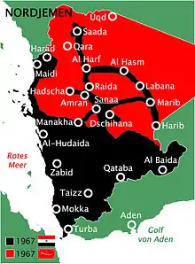 Egypt's commitment to the war is considered to have been detrimental to its performance in the Six-Day War of June 1967, after which Nasser found it increasingly difficult to maintain his army's involvement and began to pull his forces out of Yemen. The surprising removal of Sallal on November 5 by Yemeni dissidents, supported by republican tribesmen, resulted in an internal shift of power in the capital, while the royalists approached it from the north. The new republic government was headed by Qadi Abdul Rahman Iryani, Ahmed Noman and Mohamed Ali Uthman, all of whom shortly either resigned or fled the country, leaving the disarrayed capital under the control of Prime Minister Hassan al-Amri. The 1967 siege of Sanaa became the turning point of the war. The remaining republican Prime Minister succeeded in keeping control of Sana'a and by February 1968, the royalists lifted the siege. Clashes continued in parallel with peace talks until 1970, when Saudi Arabia recognized the Republic,[14] and a ceasefire came into effect.[15]
