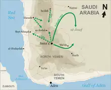 Between December 1964 and February 1965 the royalists discerned four Egyptian attempts to drive directly into the Razih mountains. The intensity of these thrusts gradually diminished, and it was estimated that the Egyptians lost 1,000 men killed, wounded and taken prisoner. Meanwhile, the royalists were building up an offensive.[57] The Egyptian line of communications went from San'a to Amran, then Khairath, where it branched off north-eastwards to Harf. From Harf it turned due south to Farah, and then South-eastwards to Humaidat, Mutamah and Hazm. From Hazm it led south-eastwards to Marib and Harib. A military convoy went over this route twice a month. Since the royalists had closed the direct route across the mountains from San'a to Marib, the Egyptians had no other way.[58]