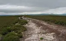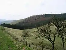 The Cheviot Hills, in the northwest of the county, consist mainly of resistant Devonian granite and andesite lava. A second area of igneous rock underlies the Whin Sill (on which Hadrian's Wall runs), an intrusion of Carboniferous dolerite. Both ridges support a rather bare moorland landscape. Either side of the Whin Sill the county lies on Carboniferous Limestone, giving some areas of karst landscape.[11] Lying off the coast of Northumberland are the Farne Islands, another dolerite outcrop, famous for their bird life.