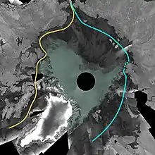 In the 21st century, major changes to the ice pack due to climate change have stirred speculation that the passage may become clear enough of ice to permit safe commercial shipping for at least part of the year. On August 21, 2007, the Northwest Passage became open to ships without the need of an icebreaker. According to Nalan Koc of the Norwegian Polar Institute, this was the first time the Passage has been clear since they began keeping records in 1972.[6][20] The Northwest Passage opened again on August 25, 2008.[21] It is usually reported in mainstream media that ocean thawing will open up the Northwest Passage (and the Northern Sea Route) for various kind of ships, making it possible to sail around the Arctic ice cap[22] and possibly cutting thousands of miles off shipping routes. Warning that the NASA satellite images suggested that the Arctic had entered a "death spiral" caused by climate change, Professor Mark Serreze, a sea ice specialist at the U.S. National Snow and Ice Data Center (NSIDC) said: "The passages are open. It's a historic event. We are going to see this more and more as the years go by."[23][24][25]