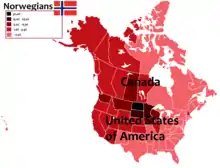 Norwegian genetic ancestry also exists in many locations where Norwegians immigrated. In particular, several northern states in the United States (Michigan, Minnesota, North Dakota, South Dakota, and Montana) show Scandinavian (which includes Norwegian) ancestry proportions among European descent (white) persons of 10 to 20%.[43] Similarly, Norwegian ancestry has been found to account for about 25% of ancestry of the population of the Shetland Islands and Danish-Norwegian ancestry has been found to account for about 25% of ancestry of the population of Greenland.[44][45]