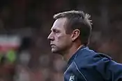 Joe Kinnear was subsequently appointed and led the club to a secure 14th place in the final league table.[75] The 2004–05 season saw Forest drop into the relegation zone once more, leading to Kinnear's resignation in December 2004.[76] Mick Harford took temporary charge of Forest over Christmas, before Gary Megson was appointed in the new year. Megson had already won two promotions to the Premier League with his previous club West Bromwich Albion, having arrived at the club when they were in danger of going down to Division Two, but failed to stave off relegation as the club ended the season second from bottom in 23rd place,[77] becoming the first European Cup-winners ever to fall into their domestic third division.[78]