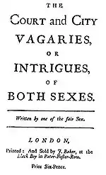 Europe witnessed the generic shift in the titles of works in French published in Holland, which supplied the international market and English publishers exploited the novel/romance controversy in the 1670s and 1680s.[47] Contemporary critics listed the advantages of the new genre: brevity, a lack of ambition to produce epic poetry in prose; the style was fresh and plain; the focus was on modern life, and on heroes who were neither good nor bad.[48] The novel's potential to become the medium of urban gossip and scandal fueled the rise of the novel/novella. Stories were offered as allegedly true recent histories, not for the sake of scandal but strictly for the moral lessons they gave. To prove this, fictionalized names were used with the true names in a separate key. The Mercure Gallant set the fashion in the 1670s.[49] Collections of letters and memoirs appeared, and were filled with the intriguing new subject matter and the epistolary novel grew from this and led to the first full blown example of scandalous fiction in Aphra Behn's Love-Letters Between a Nobleman and His Sister (1684/ 1685/ 1687). Before the rise of the literary novel, reading novels had only been a form of entertainment.[50]