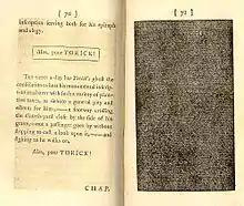 An example of the experimental novel is Laurence Sterne's The Life and Opinions of Tristram Shandy, Gentleman (1759–1767), with its rejection of continuous narration.[57] In it the author not only addresses readers in his preface but speaks directly to them in his fictional narrative. In addition to Sterne's narrative experiments, there are visual experiments, such as a marbled page, a black page to express sorrow, and a page of lines to show the plot lines of the book. The novel as a whole focuses on the problems of language, with constant regard to John Locke's theories in An Essay Concerning Human Understanding.[58]