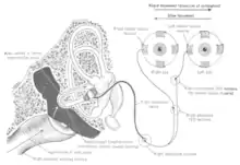 In normal eyesight, while the head rotates about an axis, distant visual images are sustained by rotating eyes in the opposite direction of the respective axis.[4] The semicircular canals in the vestibule of the ear sense angular acceleration, and send signals to the nuclei for eye movement in the brain. From here, a signal is relayed to the extraocular muscles to allow one's gaze to fix on an object as the head moves. Nystagmus occurs when the semicircular canals are stimulated (e.g., by means of the caloric test, or by disease) while the head is stationary. The direction of ocular movement is related to the semicircular canal that is being stimulated.[5]