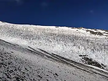 Penitentes have been encountered by climbers as early as 1937,[48] in 1949 there were reportedly 5–8 metres (16–26 ft) high penitentes on Ojos del Salado.[72] Penitentes are high ice spires[73] which form when ice sublimates in the intense insolation.[68]
