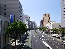 Okinawa Island (沖縄島, Okinawa-jima, Okinawan: 沖縄/うちなー, Uchinaa[4] Kunigami: ふちなー, Fuchináa), officially Okinawa Main Island (沖縄本島, Okinawa-hontō),[5] is the largest of the Okinawa Islands and the Ryukyu (Nansei) Islands of Japan in the Kyushu region. It is the smallest and least populated of the five main islands of Japan.[6] The island is approximately 106 kilometres (66 mi) long, an average 11 kilometres (7 mi) wide,[7] and has an area of 1,206.98 square kilometers (466.02 sq mi). It is roughly 640 kilometres (350 nmi; 400 mi) south of the main island of Kyushu and the rest of Japan. It is 500 km (270 nmi; 310 mi) northeast of Taiwan. The total population of Okinawa Island is 1,384,762.[3] The Greater Naha area has roughly 800,000 residents, while the city itself has about 320,000 people. Naha is the seat of Okinawa Prefecture on the southwestern part of Okinawa Island. Okinawa has a humid subtropical climate.