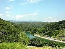 The Motobu Peninsula in the north has limestone layers and karst development.[39] In the center and south is mainly a Ryukyu limestone layer and mudstone.[39] The topography is flat, there are few hills over 100 m (328 ft) with very few rivers. The subtropical rains accelerate erosion so there are many drainages and uvala. The southern end of the island consists of uplifted coral reef, whereas the northern half has proportionally more igneous rock. The easily eroded limestone of the south has many caves, the most famous of which is Gyokusendō in Nanjō. The northernmost Cape Hedo is only 22 km (14 mi) away from Yoronjima. Cape Arasaki is the southernmost location of Okinawa island. It is sometimes confused with Cape Kiyanmisaki.