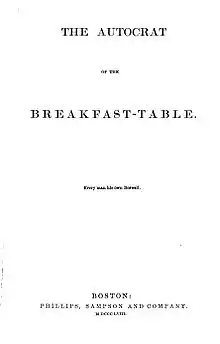 Holmes first gained international fame with his "Breakfast-Tables" series.[154] These three table-talk books attracted a diverse audience due to their conversational style, which made readers feel an intimate connection to the author, and resulted in a flood of letters from admirers.[155] The series' conversational tone is not only meant to mimic the philosophical debates and pleasantries that occur around the breakfast table, but it is also used in order to facilitate an openness of thought and expression.[156] As the Autocrat, Holmes states in the first volume: