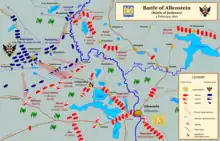 On February 3 1807, the Battle of Allenstein took place. The French Army clashed with the Imperial Russian army. On that day, Allenstein was visited by Napoleon Bonaparte. Napoleon gathered enormous forces in the city and planned to engage the Russians and Prussians in a decisive battle. The Russian army was stationed in Jonkowo, but retreated after the French attack. Thanks to the victory at Allenstein, Napoleon's army was able to move north and a few days later the general Battle of Eylau took place.[20]