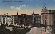 During the war five forced labour camps were established in the city.[11] On 12 October 1939, the Wehrmacht established an area headquarters for one of its military districts, Wehrkreis I (headquartered at Königsberg), that controlled the environs of Allenstein, including Lötzen (now Giżycko), and Ciechanów in occupied Poland. As part of the Aktion T4, Nazi Germany conducted medical experiments on the patients of the psychiatric hospital in the present-day district of Kortowo, in which at least 5,000 people were killed.[41]