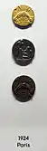 | 1924 | Paris, France | Obverse: An athlete helping another to stand Reverse: A harp and various items of sports equipment |